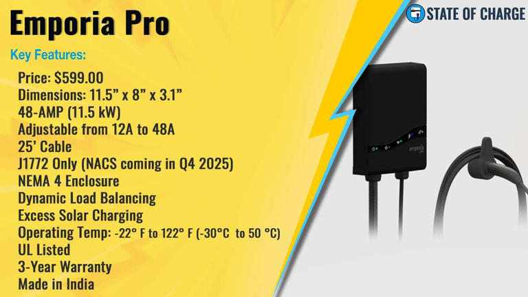 Emporia Pro គឺជាឆ្នាំងសាក 48-amp ជំនាន់ទីពីរពី Emporia។ ក្រុមហ៊ុនផ្តល់ជូននូវឧបករណ៍សន្សំសំចៃថាមពលជាច្រើនប្រភេទសម្រាប់គេហដ្ឋាន ហើយ Emporia Pro ត្រូវបានរចនាឡើងមិនត្រឹមតែដើម្បីសាកថ្មរថយន្ត EV របស់អ្នកប៉ុណ្ណោះទេ ប៉ុន្តែថែមទាំងដើម្បីឱ្យសមនឹងប្រព័ន្ធអេកូឡូស៊ីផលិតផលរបស់ Emporia ផងដែរ។