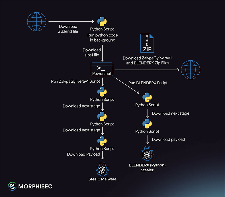 ខ្សែសង្វាក់វាយប្រហារសំខាន់ពាក់ព័ន្ធនឹងការផ្ទុកឯកសារ .blend ព្យាបាទទៅកាន់គេហទំព័រទ្រព្យសម្បត្តិ 3D ឥតគិតថ្លៃដូចជា CGTrader ដែលមានស្គ្រីប "Rig_Ui.py" ព្យាបាទ ដែលត្រូវបានប្រតិបត្តិភ្លាមៗនៅពេលដែលពួកគេត្រូវបានបើកជាមួយនឹងមុខងារ Auto Run របស់ Blender ។ នេះ, នៅក្នុងវេន, ទាញយកស្គ្រីប PowerShell ដើម្បីទាញយកបណ្ណសារ ZIP ពីរ.