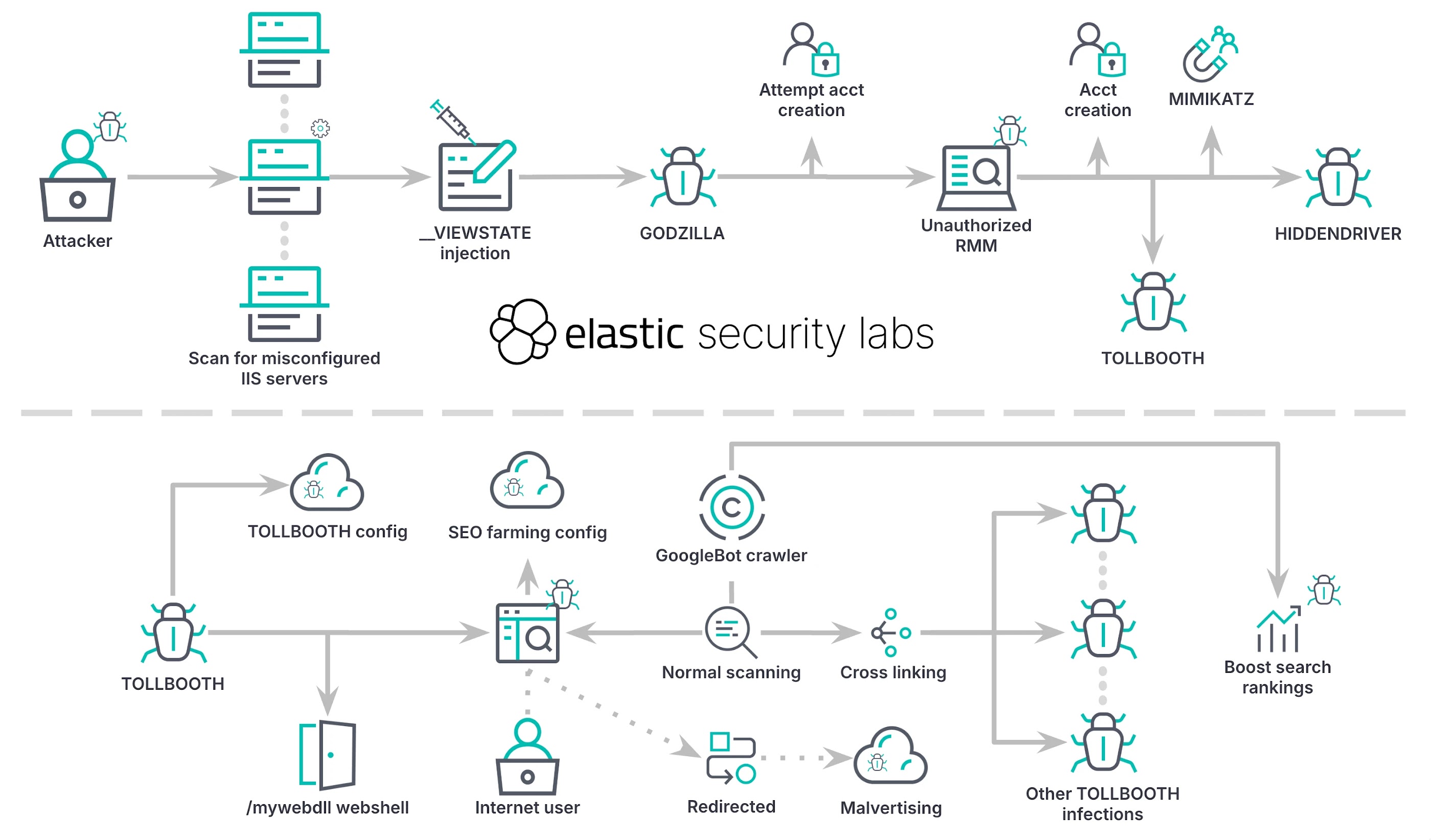 ក្នុងរយៈពេលប៉ុន្មានខែថ្មីៗនេះ អ្នកប្រមាញ់ការគំរាមកំហែងក៏បានប្រទះឃើញអ្នកគំរាមកំហែងនិយាយភាសាចិនដែលកំណត់គោលដៅម៉ាស៊ីនមេ IIS ដែលត្រូវបានកំណត់រចនាសម្ព័ន្ធមិនត្រឹមត្រូវដោយប្រើសោម៉ាស៊ីនដែលបង្ហាញជាសាធារណៈដើម្បីដំឡើង backdoor ដែលមានឈ្មោះថា TOLLBOOTH (ហៅកាត់ថា HijackServer) ដែលភ្ជាប់មកជាមួយនឹងសមត្ថភាព SEO cloaking និង web shell។