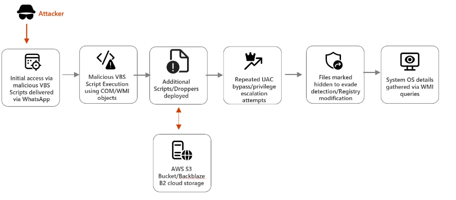 សកម្មភាពនេះចាប់ផ្តើមជាមួយអ្នកវាយប្រហារចែកចាយឯកសារ VBS ដែលមានគំនិតអាក្រក់តាមរយៈសារ WhatsApp ដែលនៅពេលប្រតិបត្តិ បង្កើតថតឯកសារដែលលាក់នៅក្នុង "C:\ProgramData" ហើយទម្លាក់កំណែដែលបានប្តូរឈ្មោះនៃឧបករណ៍ប្រើប្រាស់ Windows ស្របច្បាប់ដូចជា "curl.exe" (ប្តូរឈ្មោះជា "netapi.dll") និង "bitsadmin.exe" (ប្តូរឈ្មោះជា "sc.exe")។