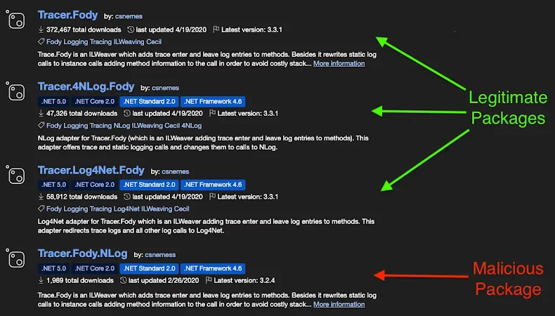 កញ្ចប់ដែលមានគំនិតអាក្រក់នេះ ដែលមានឈ្មោះថា "Tracer.Fody.NLog" នៅតែមាននៅលើឃ្លាំងអស់រយៈពេលជិតប្រាំមួយឆ្នាំ។ វាត្រូវបានបោះពុម្ពផ្សាយដោយអ្នកប្រើប្រាស់ម្នាក់ឈ្មោះ "csnemess" នៅថ្ងៃទី 26 ខែកុម្ភៈ ឆ្នាំ 2020។ វាក្លែងបន្លំជា "Tracer.Fody" ដែលត្រូវបានថែរក្សាដោយ "csnemes"។ កញ្ចប់នេះនៅតែបន្តអាចប្រើបាននៅពេលសរសេរនេះ ហើយត្រូវបានទាញយកយ៉ាងហោចណាស់ 2,000 ដង ដែលក្នុងនោះ 19 ដងបានកើតឡើងក្នុងរយៈពេលប្រាំមួយសប្តាហ៍ចុងក្រោយសម្រាប់កំណែ 3.2.4។