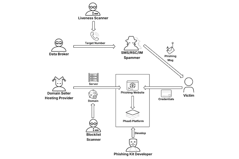នេះរួមបញ្ចូលទាំងអ្នកអភិវឌ្ឍន៍ឧបករណ៍បន្លំ (phishing kit) អ្នកសម្របសម្រួលទិន្នន័យ (ដែលលក់លេខទូរស័ព្ទគោលដៅ) អ្នកលក់ដូមេន (ដែលចុះឈ្មោះដូមេនចោលសម្រាប់បង្ហោះគេហទំព័របន្លំ) អ្នកផ្តល់សេវាបង្ហោះ (ដែលផ្តល់ម៉ាស៊ីនមេ) អ្នកផ្ញើសារឥតបានការ (ដែលផ្ញើសារទៅជនរងគ្រោះក្នុងទ្រង់ទ្រាយធំ) អ្នកស្កេនភាពរស់រវើក (ដែលផ្ទៀងផ្ទាត់លេខទូរស័ព្ទ) និងម៉ាស៊ីនស្កេនបញ្ជីរារាំង (ដែលពិនិត្យមើលដូមេនបន្លំប្រឆាំងនឹងបញ្ជីរារាំងដែលគេស្គាល់សម្រាប់ការបង្វិល)។