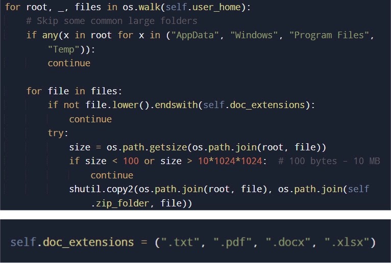 មេរោគនេះក៏ប្រមូលឯកសារដោយស្កេនថតផ្ទះរបស់អ្នកប្រើប្រាស់សម្រាប់ឯកសារដែលមានផ្នែកបន្ថែមជាក់លាក់ដូចជា .pdf, .docx និង .xlsx ដោយត្រងលទ្ធផលតាមទំហំឯកសារដើម្បីជៀសវាងការចំណាយលើបណ្តាញ។