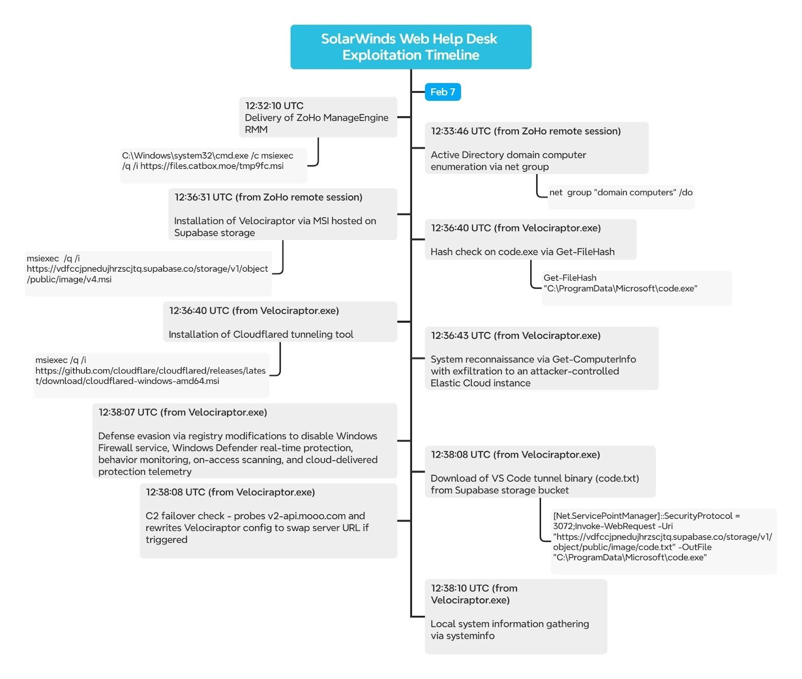 នៅក្នុងរបាយការណ៍មួយដែលបានចេញផ្សាយនៅថ្ងៃទី 8 ខែកុម្ភៈ ឆ្នាំ 2026 ក្រុមហ៊ុនសន្តិសុខតាមអ៊ីនធឺណិត Huntress បាននិយាយថា ខ្លួនបានស៊ើបអង្កេតករណីនៃការកេងប្រវ័ញ្ច SolarWinds WHD ដែលក្នុងនោះភ្នាក់ងារគំរាមកំហែងបានដាក់ពង្រាយ Zoho Meetings និង Cloudflare tunnels យ៉ាងឆាប់រហ័សសម្រាប់រក្សាស្ថេរភាព ក៏ដូចជាឧបករណ៍កោសល្យវិច្ច័យស្របច្បាប់មួយហៅថា Velociraptor សម្រាប់បញ្ជា និងគ្រប់គ្រង (C2)។ ហេតុការណ៍នេះបានកើតឡើងនៅថ្ងៃទី 7 ខែកុម្ភៈ ឆ្នាំ 2026។